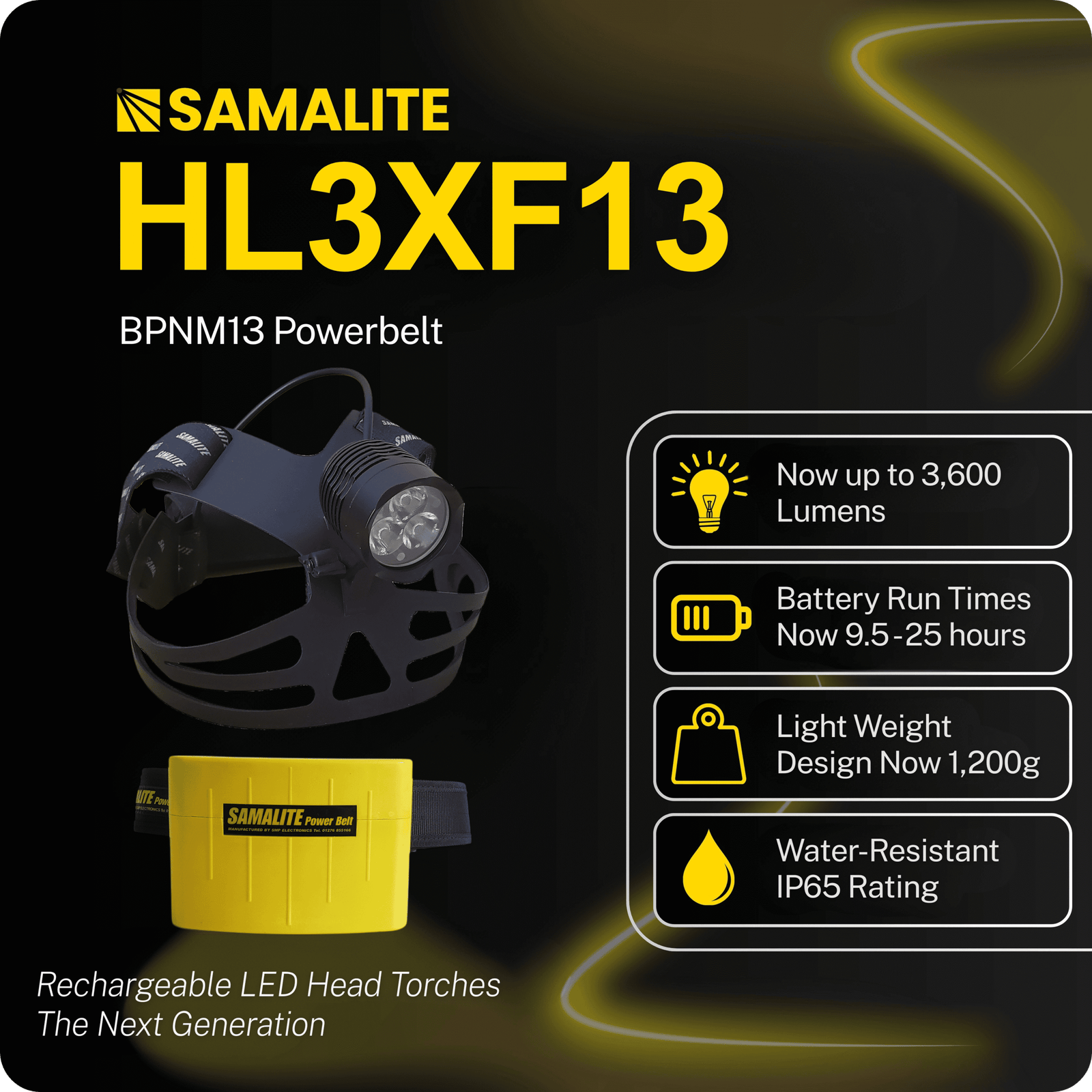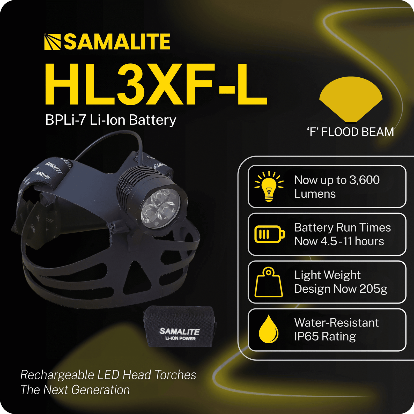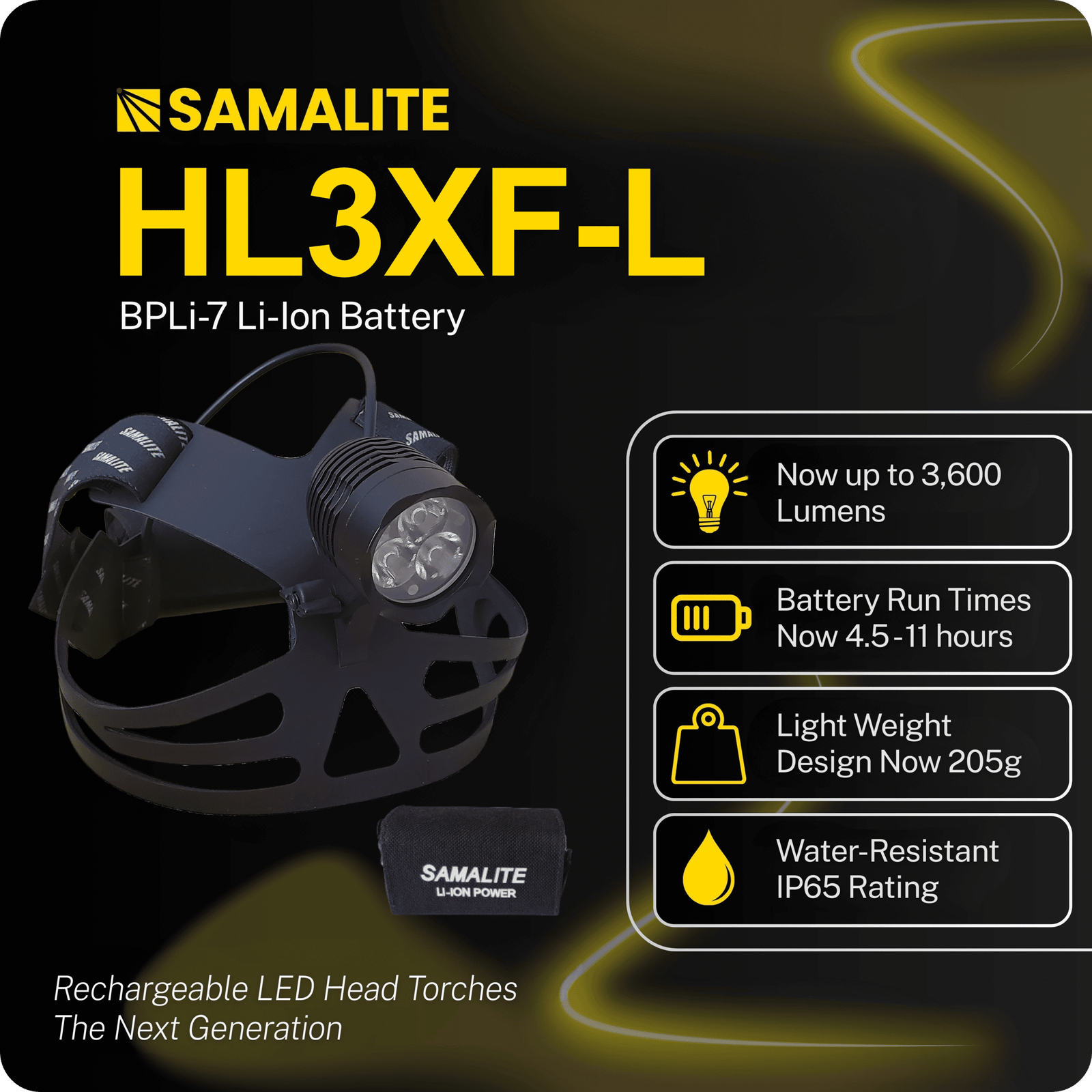 The new SAMALITE HL3XF-L LED high powered rechargeable head torch now produces an amazing 3600 Lumens for 4.5 Hours on brightest setting, 7 hours on middle and 11 hours on low.