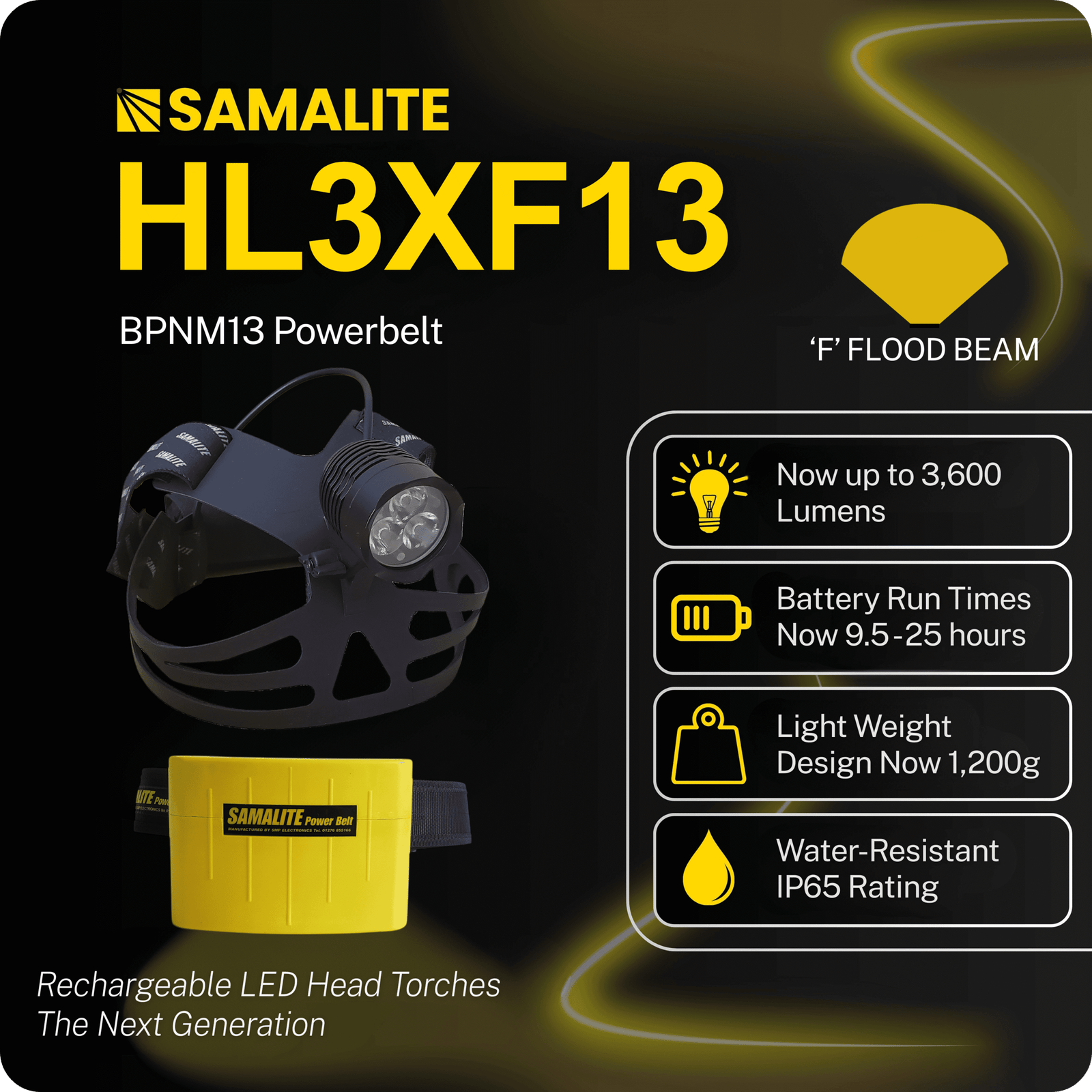 The Samalite HL600F can also be purchased with the Samalite Industrial BPNM13 Powerbelt for extended runtimes.