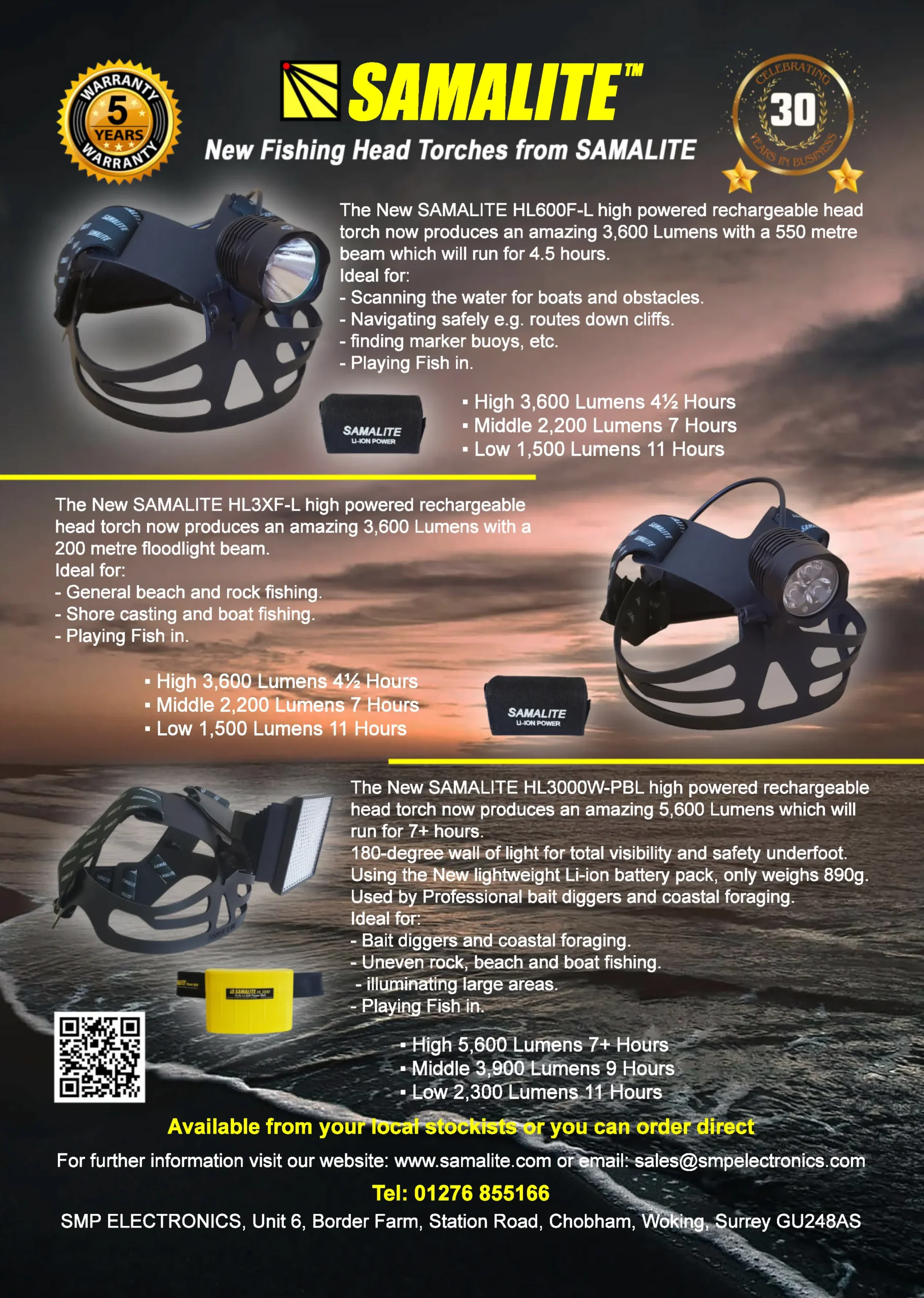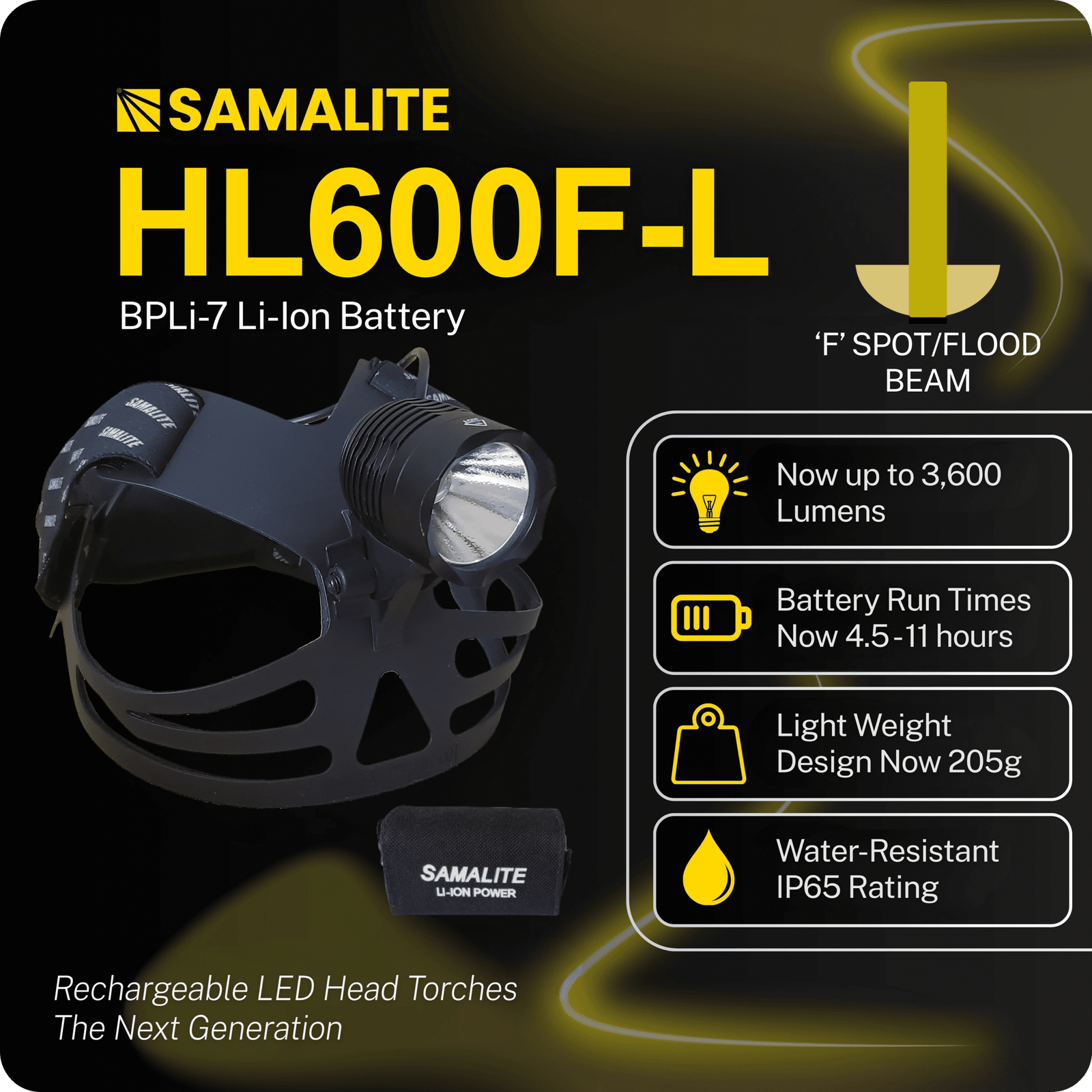 The new SAMALITE HL600F-LRJ LED high powered rechargeable head torch now produces an amazing 3600 Lumens for 4.5 Hours on brightest setting, 7 hours on middle and 11 hours on low.