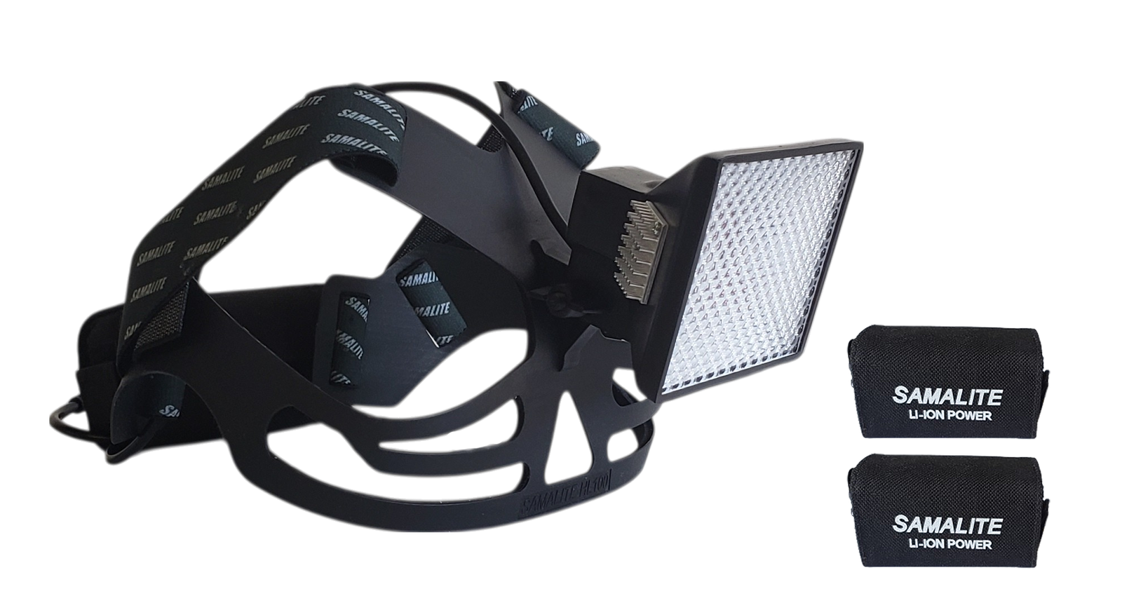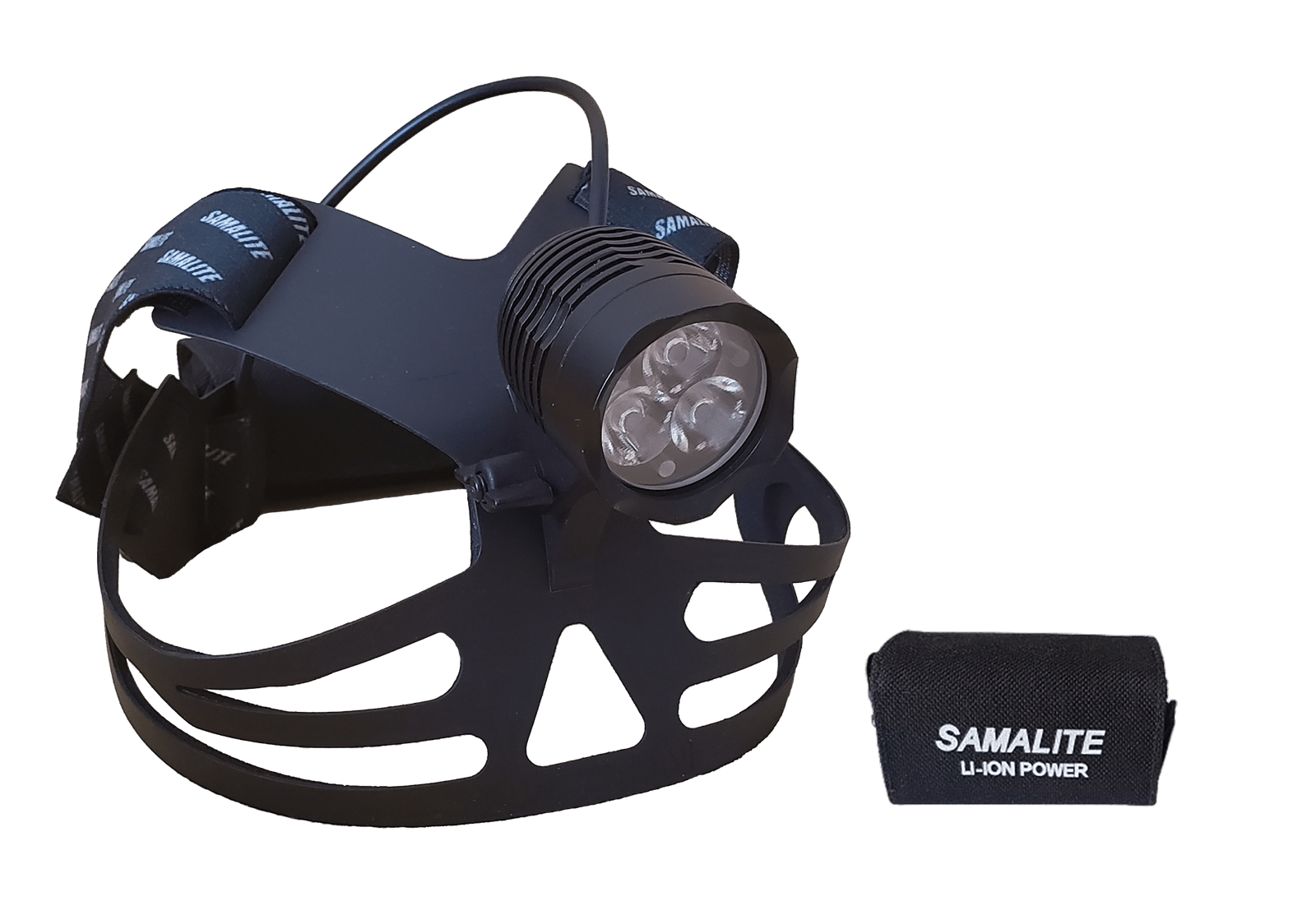 The small SAMALITE BPLi-7RJ Li-Ion light weight battery weighs only 260g which can be carried on its headband with a combined weight of only 435g, or on a waist belt using the supplied extension cable or fitted to a hard hat.