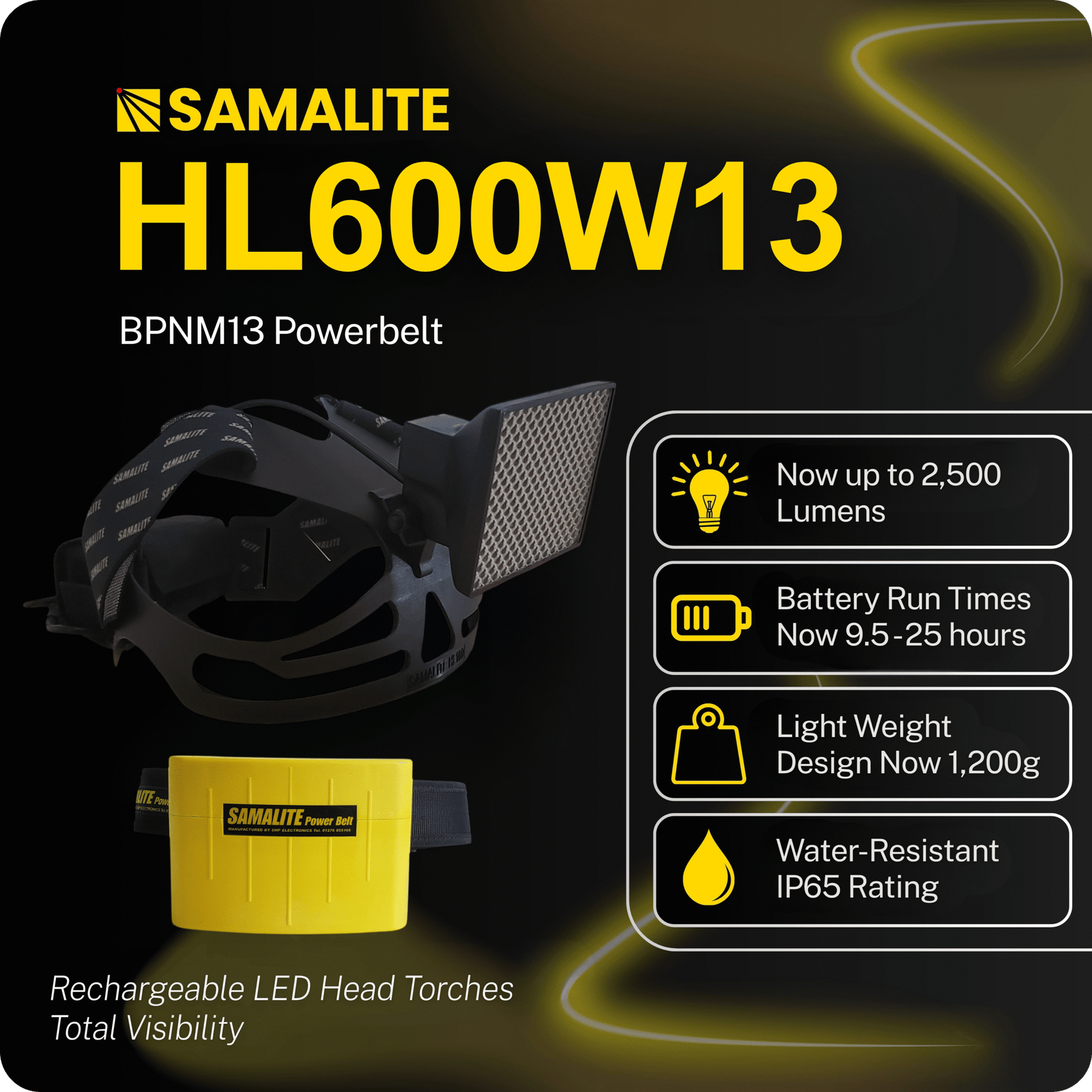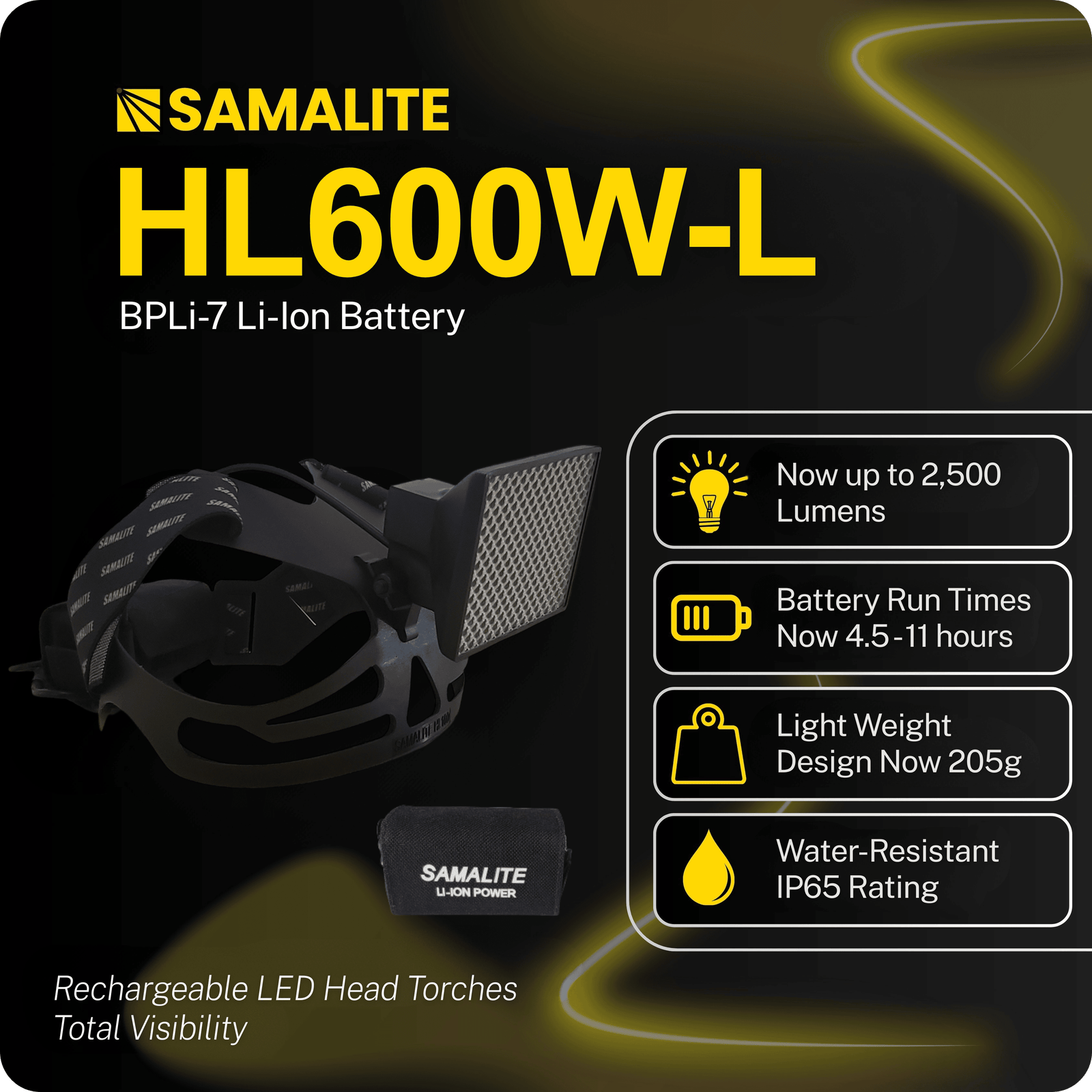 The Samalite HL600W can be purchased with either the small Li-Ion battery or Samalite Industrial BPNM13 Powerbelt for extended run times of up to 9½ hours on high, 12 hours Medium and 25 hours on Low.