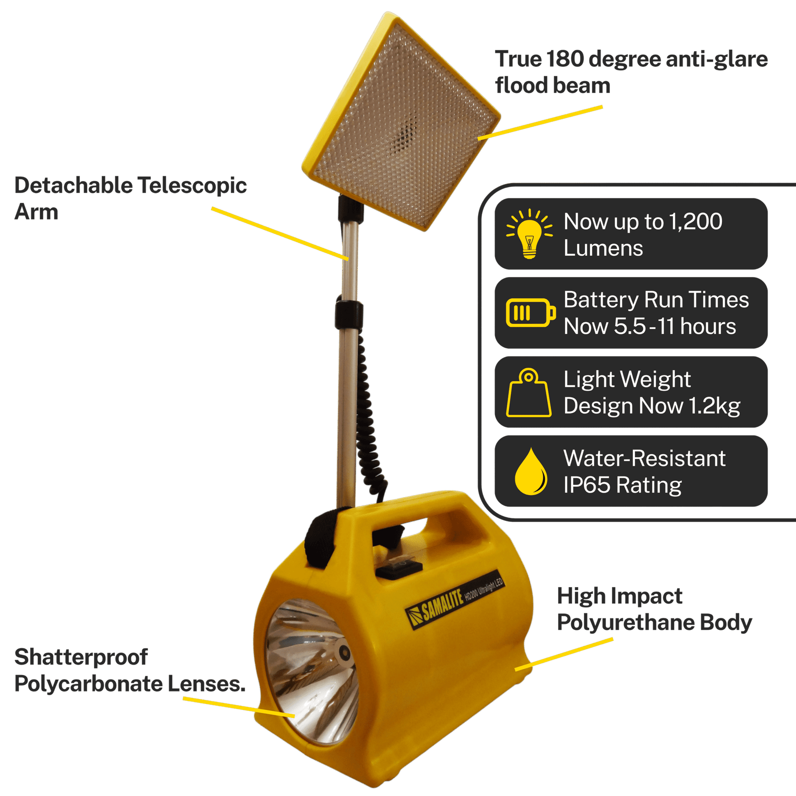 Each Samalite Ultralight is IP65 rated, fully weatherproof, frost, heat, water and fuel resistant with a high impact polyurethane body and shatterproof polycarbonate lenses.